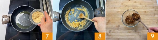 Ajoutez la chapelure 7 et mélangez avec une cuillère en bois 8. Faites cuire quelques minutes jusqu'à ce qu'elle soit bien grillée et légèrement dorée. Transférez-la ensuite dans un bol 9.