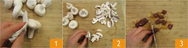 Pour préparer les œufs au plat avec champignons et tomates, commencez par nettoyer les champignons : après avoir coupé la partie terreuse à la base, grattez le chapeau avec du papier essuie-tout 1, ou un torchon, humidifié. Coupez-les en tranches fines de demi-centimètre 2. Coupez les tomates séchées égouttées de leur huile de conservation en 2-3 morceaux également 3.