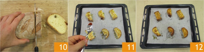 Pendant que les champignons cuisent, tranchez le pain 10, disposez-le sur une plaque avec du papier sulfurisé et saupoudrez la surface d'huile, de sel, de poivre et d'une pincée de paprika fumé 11 et faites toaster dans un four préchauffé à 200°, dans la partie supérieure (sans contact avec la résistance) pendant environ 5-6 minutes 12.