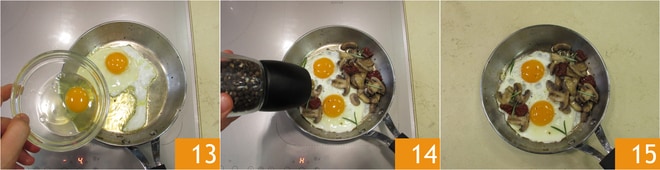Quand tout est prêt, occupez-vous de la cuisson des œufs : dans la poêle avec le fond, cassez deux œufs 13, si vous préférez, faites-le dans un bol pour ne pas casser le jaune. Cuisez pour le temps que vous jugez approprié (environ 3-4 minutes au maximum, le temps nécessaire pour que le blanc prenne et que le jaune soit suffisamment crémeux). Quand le blanc a pris consistance, versez l'accompagnement dans la poêle, poivrez 14, salez et enfin dégustez immédiatement les œufs au plat avec champignons et tomates en les accompagnant de pain toasté 15.