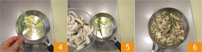 Dans une poêle avec de l'huile, chauffez l'ail et le romarin 4. Ajoutez ensuite les champignons 5 et après une rapide flambée, salez, ce qui permettra de libérer l'eau de végétation. Dès que celle-ci s'est presque entièrement évaporée 6