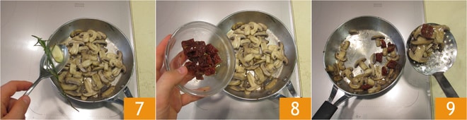 retirez l'ail et le romarin 7, ajoutez les tomates séchées 8 et faites sauter brièvement ; mettez de côté les champignons 9 et laissez le fond dans la poêle.
