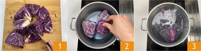 Pour préparer les œufs colorés, commencez par couper le chou rouge en morceaux 1. Plongez le chou rouge dans l'eau 2 et laissez-le cuire pendant 30 minutes 3.