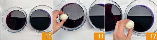 De cette façon, l'un deviendra violet et l'autre restera bleu 10. Maintenant, plongez la moitié des œufs dans le bol avec l'eau violette 11 et l'autre moitié dans le bol avec l'eau bleue 12.