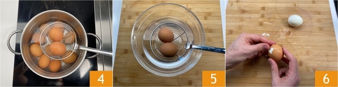 Entre-temps, plongez les œufs dans de l'eau bouillante, en vous aidant d'une écumoire 4. Faites cuire pendant 8 minutes, puis égouttez-les et plongez-les dans un bol d'eau froide 5. Écalez-les délicatement 6 et réservez-les.