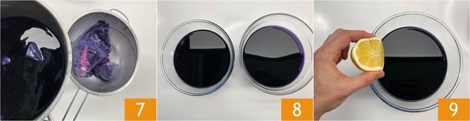 Après les 30 minutes de cuisson du chou rouge, laissez-le tiédir et filtrez le liquide de cuisson 7. Divisez-le dans deux bols 8 et dans l'un des deux bols versez le jus de citron 9 et mélangez.