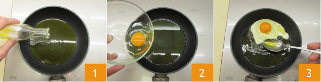 Pour préparer les œufs frits, nous vous conseillons d'utiliser une poêle antiadhésive, versez de l'huile jusqu'à couvrir tout le fond 1. Faites-la chauffer puis cassez un œuf dans un bol 2. Faites cuire à feu moyen-vif en inclinant de temps en temps la poêle pour recueillir l'huile avec une cuillère et arroser la surface 3.