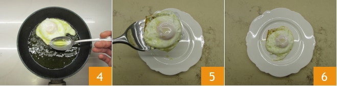 Continuez ainsi jusqu'à ce qu'une pellicule blanche se forme à la surface 4. En environ 2-3 minutes, l'œuf frit sera prêt 5, servez à votre goût avec du sel et du poivre 6.