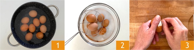 Pour préparer les œufs gratinés, commencez par faire cuire les œufs dans une grande quantité d'eau 1 et faites-les cuire pendant 8 minutes à partir de l'ébullition. Une fois ce temps écoulé, plongez les œufs dans de l'eau très froide 2 puis écalez-les 3.