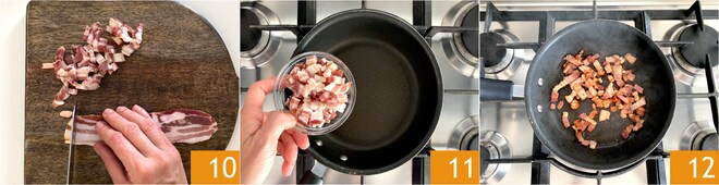 Coupez le bacon fumé en morceaux 10 et faites-le revenir dans une poêle antiadhésive 11 jusqu'à ce qu'il soit bien croustillant 12.