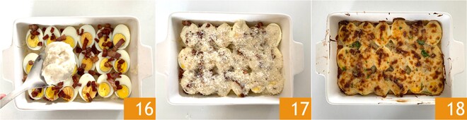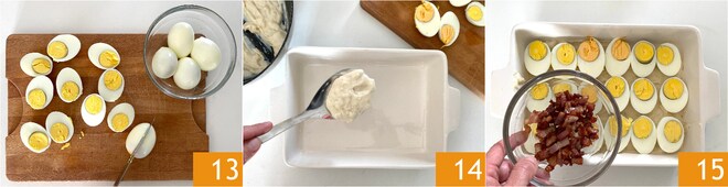 Coupez les œufs en deux 13. Versez la moitié de la béchamel sur le fond du plat 14 et disposez les œufs dans le plat, côte à côte. Ajoutez les morceaux de bacon 15.