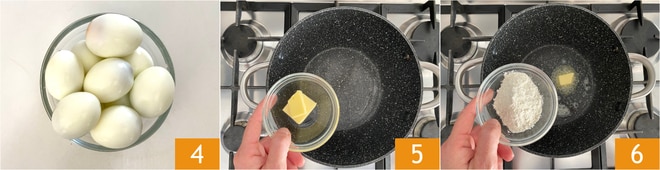 Réservez-les dans un bol 4. Préparez la béchamel : faites fondre le beurre dans une petite casserole 5, ajoutez la farine 6.