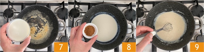 et juste après, le lait en filet 7, en remuant avec un fouet pour éviter la formation de grumeaux. Assaisonnez avec de la noix de muscade 8, du sel et du poivre noir et faites cuire à feu doux jusqu'à ce que cela épaississe, puis éteignez le feu 9.