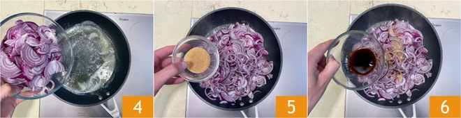 Fais-le fondre à feu doux puis ajoute les oignons 4 avec le sucre de canne 5 et le vinaigre balsamique 6.