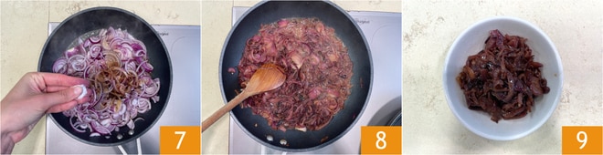 Ajoute une pincée de sel 7 et fais cuire pendant 20 minutes à feu doux ou le temps nécessaire pour attendrir les oignons 8. L'oignon caramélisé est prêt à être dégusté 9.