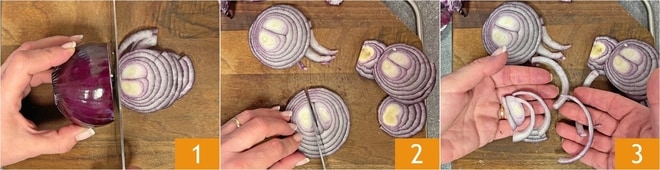 Pour réaliser l'oignon croustillant, nettoyez et coupez les oignons rouges en tranches d'environ 7 mm d'épaisseur 1, puis divisez chaque tranche en deux 2 pour obtenir des lanières 3.