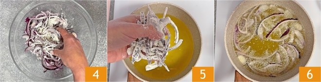 Farinez les tranches d'oignon 4 et éliminez l'excès de farine. Chauffez l'huile de graines et plongez une poignée d'oignons à la fois dans l'huile bouillante 5. Faites frire les oignons en les retournant souvent avec une écumoire jusqu'à ce qu'ils changent de couleur 6.