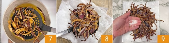 Une fois dorés uniformément, égouttez-les 7 et transférez-les sur du papier absorbant 8. Laissez refroidir complètement et saupoudrez de gros sel 9. Votre oignon croustillant est prêt à être dégusté !