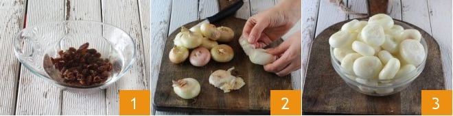 Pour réaliser la recette des oignons aux raisins secs, commencez par faire tremper les raisins secs pendant 20 minutes dans un verre d'eau tiède 1. Pendant ce temps, épluchez les petits oignons 2 et rassemblez-les dans un bol 3.