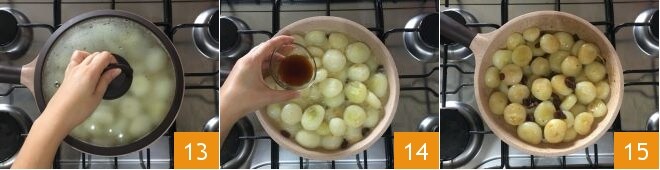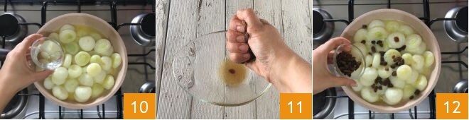 À ce stade, salez, poivrez et poursuivez la cuisson pendant 7 minutes à couvert 13. Ensuite, déglacez avec le marsala 14, laissez évaporer, puis couvrez de nouveau la poêle et continuez la cuisson pendant encore 7 minutes. À la fin, les oignons deviendront tendres et le fond de cuisson sera presque entièrement évaporé 15. Servez les oignons aux raisins secs chauds.