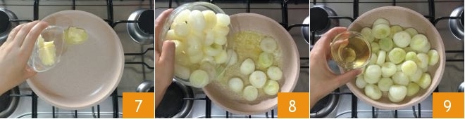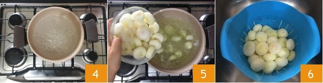 Placez une casserole remplie d'eau salée sur le feu et portez à ébullition 4, puis ajoutez les oignons et blanchissez-les pendant 2 minutes 5. Ensuite, égouttez-les 6 et réservez-les.