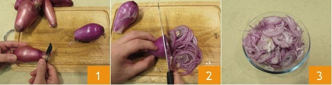 Pour préparer les oignons de Tropea caramélisés, commencez par les éplucher en retirant à la fois la peau et les deux extrémités 1. Ensuite, passez à la découpe: vous pouvez les trancher pas trop finement avec une lame lisse 2 et recueillir les rondelles obtenues dans un récipient 3.