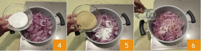Versez les oignons tranchés dans une grande casserole avec le sucre en poudre 4 et le sucre de canne 5, mélangez bien pour que les ingrédients s'amalgament entre eux et ajoutez l'eau 6.