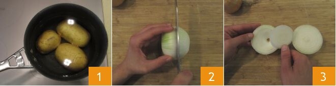 Pour préparer les oignons farcis à la truffe, commencez par faire cuire les pommes de terre dans une grande quantité d'eau froide 1, portez à ébullition et laissez cuire jusqu'à ce qu'elles puissent être facilement percées avec une fourchette : le temps de cuisson varie en fonction de la taille des pommes de terre, cela prendra environ 30-40 minutes. Pendant ce temps, épluchez les oignons, divisez-les en deux transversalement 2 et videz-les en retirant les couches internes 3.