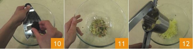 et ajoutez 4 g de truffe noire, en utilisant un coupe-truffe approprié (10-11), puis écrasez les pommes de terre encore chaudes directement dans le bol 12.