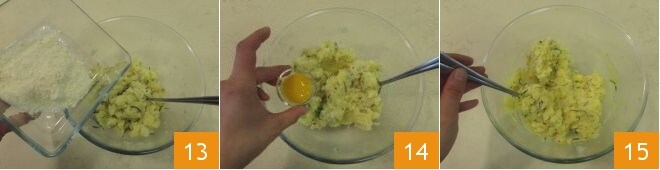 Ajoutez également le Parmigiano râpé 13, le jaune d'œuf 14, du sel et du poivre et mélangez bien le tout 15. Transférez le mélange obtenu dans une poche à douille sans embout.