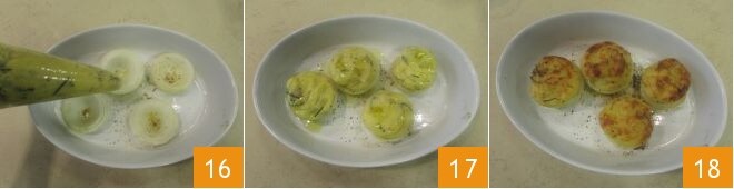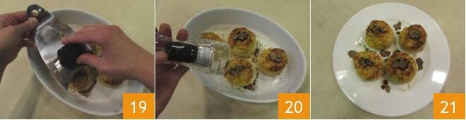 Retirez les oignons du four et remplissez-les avec le mélange de pommes de terre et de truffe 16, puis versez un filet d'huile sur le dessus 17 et faites cuire pendant 15 minutes toujours à 220°, puis allumez le gril et poursuivez la cuisson pendant encore 5 minutes 18.