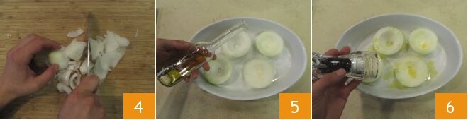 Hachez l'intérieur des oignons 4 et mettez-le temporairement de côté. Transférez les oignons évidés dans un plat allant au four, assaisonnez avec de l'huile 5, du sel et du poivre 6 et faites cuire dans un four statique préchauffé à 220° pendant 20 minutes.