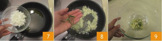 Pendant que les oignons cuisent, préparez la garniture : chauffez un filet d'huile dans une poêle, ajoutez l'oignon haché 7 et faites revenir pendant quelques minutes, puis ajoutez le romarin 8. Versez le mélange d'oignons dans un grand bol 9