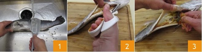 Pour préparer l'ombrine à la scottadito sur crème de pois chiches et romarin, commencez par le nettoyage de l'ombrine. Placez le poisson entier sous l'eau courante et écailles-le en utilisant l'outil approprié 1 ou, à défaut, utilisez la lame d'un couteau. Vous devez frotter l'écailleur depuis la queue le long de l'ombrine jusqu'à ce qu'elle soit complètement écaillée. Avec une paire de ciseaux, incisez le ventre du poisson sur toute sa longueur 2 et retirez les viscères 3.