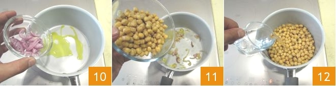 Occupez-vous maintenant de la crème de pois chiches. Coupez l'échalote en julienne, et placez-la dans une petite casserole dans laquelle vous aurez versé un filet d'huile 10. Laissez blondir l'échalote à feu doux, puis ajoutez les pois chiches 11, dans le cas où vous utilisez des pois chiches secs, cette opération devra être précédée de 12 heures de trempage. Sinon, vous pouvez utiliser des pois chiches précuits : dans ce cas, la quantité à utiliser sera de 500 g. Couvrez les pois chiches avec de l'eau 12.