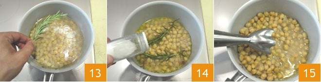 Ajoutez le romarin 13, et le sel 14, puis laissez cuire pendant 30-40 minutes. Retirez le romarin et mixez soigneusement avec un mixeur plongeant 15.