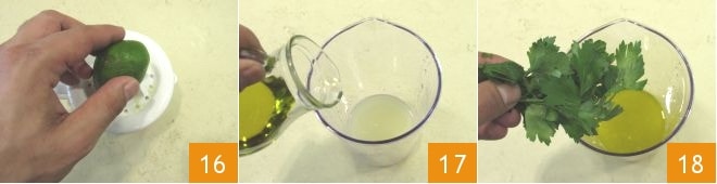 Coupez le lime et pressez-en le jus 16. Filtrez-le si nécessaire, et mettez-le dans le verre du mixeur avec environ 60 g d'huile d'olive extra vierge 17 et le persil 18.