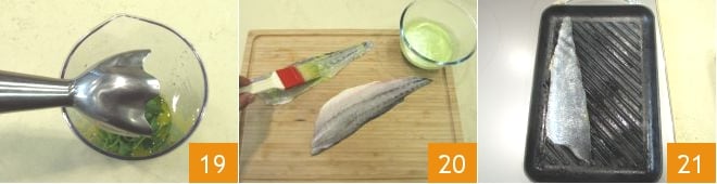 Mixez 19 jusqu'à obtenir une émulsion homogène, trempez-y un pinceau et badigeonnez les filets d'ombrine 20. Chauffez une plaque en fonte et huilez-la légèrement, puis déposez-y les filets 21 et grillez-les du côté de la chair pendant environ 5 minutes.