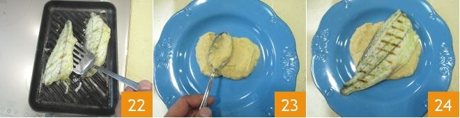 Retournez-les du côté de la peau 22, et grillez-les encore environ 5 minutes. Répartissez sur les assiettes la crème de pois chiches 23 et déposez-y les filets. L'ombrine scottadito sur crème de pois chiches et romarin est prête à être dégustée 24 !