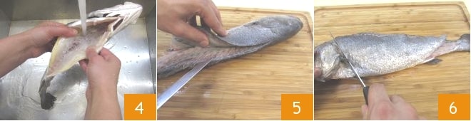 Lavez soigneusement l'intérieur éviscéré sous l'eau courante 4. Passez ensuite au filetage : faites une incision sur le dos de l'ombrine, en passant la lame d'un couteau bien aiguisé le long de l'arête du poisson jusqu'à séparer la chair de l'arête 5. Avec une deuxième incision, séparez le filet obtenu de la tête 6.