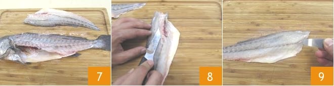 Une fois le premier filet obtenu 7, procédez de la même manière de l'autre côté pour obtenir également le deuxième. Avec un petit couteau bien aiguisé, retirez les nervures rougeâtres de la partie centrale de chaque filet 8 et enfin, avec l'aide d'une pince appropriée, retirez délicatement les arêtes 9.