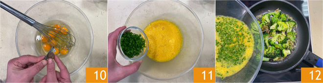 Ajoutez également une pincée de muscade 10 et de la ciboulette finement hachée 11. Battez bien le mélange et versez-le sur les brocolis, après avoir retiré l'ail 12.