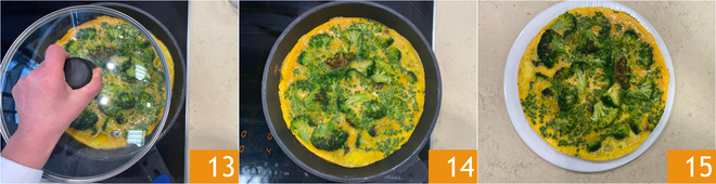 Couvrez avec un couvercle et faites cuire à feu doux pendant environ 15 minutes 13 ; de cette façon, il ne sera pas nécessaire de retourner l'omelette 14. Une fois dorée, servez immédiatement votre omelette aux brocolis 15 !