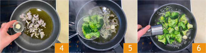 Dans une poêle, versez l'huile, l'échalote et l'ail 4. Laissez mijoter pendant environ 5 minutes à feu doux, puis égouttez les têtes de brocolis directement dans la poêle 5. Ajoutez aussi un peu d'eau de cuisson et le poivre 6.