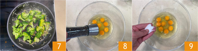 Faites cuire à feu moyen-élevé pendant environ 8 minutes 7. Pendant ce temps, cassez les œufs dans un bol et assaisonnez avec du poivre 8 et du sel 9.