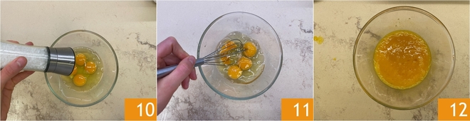 Dans un bol, cassez les œufs, ajoutez une pincée de sel 10 et battez-les bien avec un fouet 11 12.