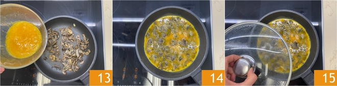Allumez à nouveau le feu sous les champignons. Ajoutez l'huile restante et lorsque la poêle est bien chaude, versez le mélange dessus 13. Attendez quelques minutes 14, puis couvrez avec un couvercle 15.