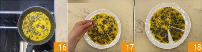 Baissez le feu et faites cuire pendant encore 8 minutes, toujours à feu doux, il ne sera pas nécessaire de retourner l'omelette. Une fois cuite 16, transférez-la sur un plat de service, garnissez de persil haché supplémentaire 17 et servez 18.