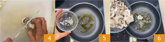 À ce stade, tranchez-les finement 4. Dans une poêle antiadhésive, chauffez 2 cuillères à café d'huile avec l'ail haché 5, ajoutez ensuite les champignons 6 et faites cuire à feu moyen pendant 8 minutes ou jusqu'à ce que l'eau soit évaporée.