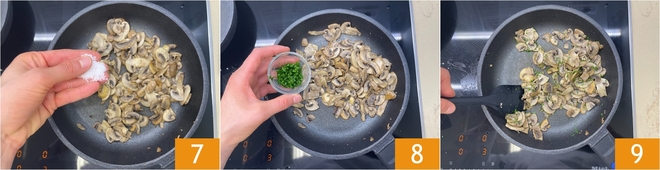Ajoutez le sel 7, le persil haché 8, mélangez bien 9, éteignez le feu et laissez tiédir.